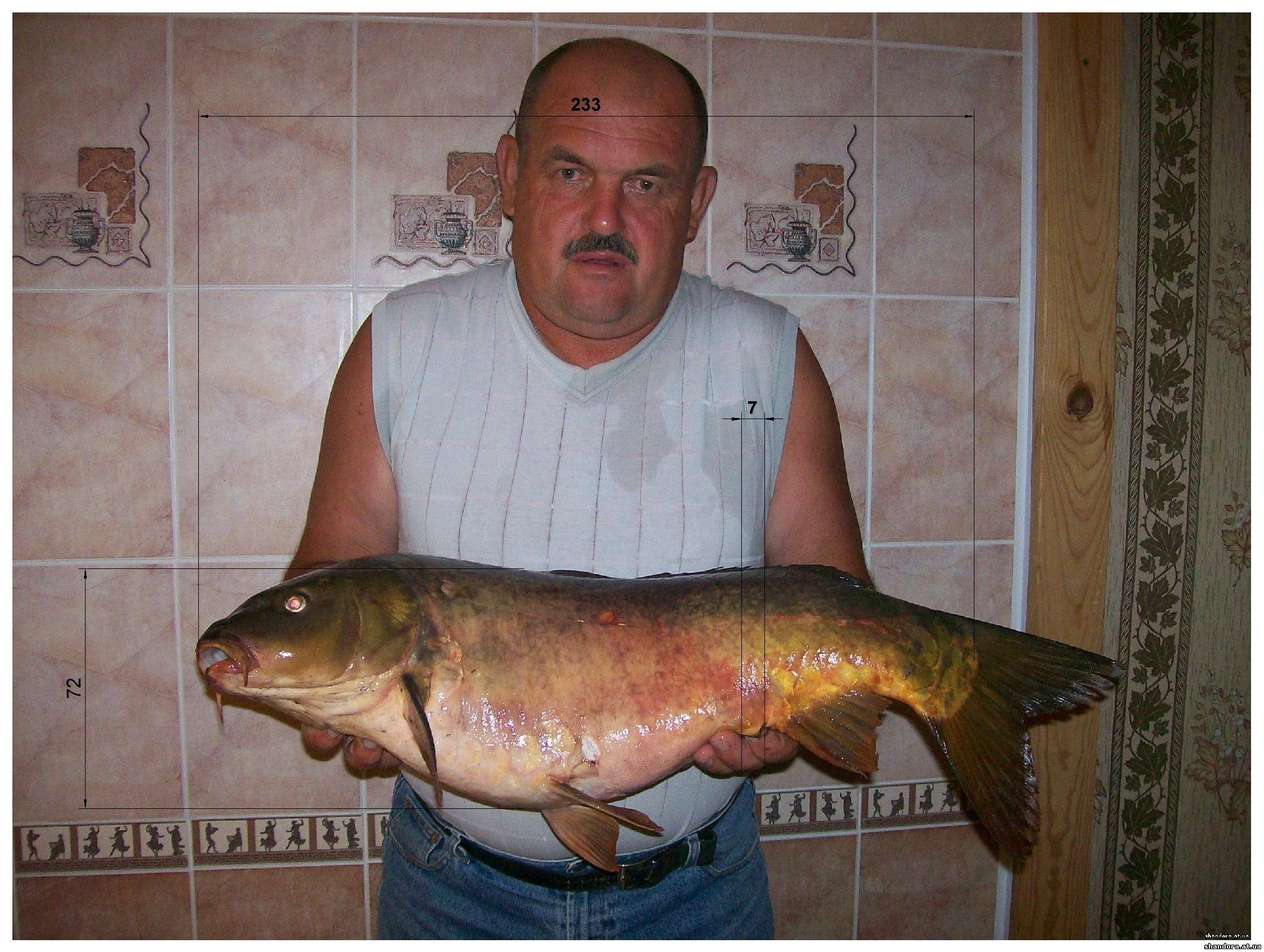 | Отношение длины тела и толщины карпа у Самата и у Игоря примерно одинаковы. 233/72 = 3,24 и 103/32 = 3,22 что позволяет более-менее точно сопоставлять длину и вес. Поскольку вес карпа у Игоря известен, подтвержден и не вызывает сомнений - 7150 грамм, можно предположить, что вес у карпа